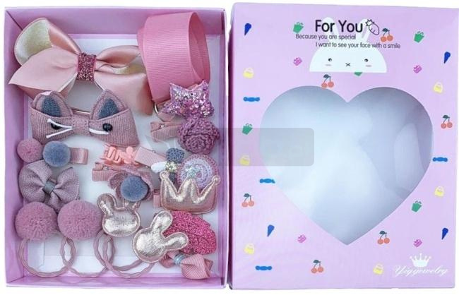 Podaruj swojej małej księżniczce ten fantastyczny zestaw uroczych akcesoriów do włosów! Ten bogaty komplet zawiera różnorodne spinki i gumki, które pozwolą na tworzenie niezliczonych, dziewczęcych stylizacji. Wśród nich znajdziesz miękkie pompony, eleganckie kokardki, urocze kwiatki, zabawne uszka króliczka, błyszczące gwiazdki oraz inne śliczne detale. Dominująca kolorystyka w odcieniach różu sprawia, że akcesoria są niezwykle dziewczęce i stylowe. Wykonane z dbałością o szczegóły, są nie tylko piękne, ale także trwałe i bezpieczne dla delikatnych włosów dziecka. Elastyczne gumki dobrze trzymają włosy, nie ciągnąc ich, a solidne spinki pewnie utrzymują fryzurę przez cały dzień. Zestaw jest zapakowany w estetyczne, różowe pudełko z okienkiem w kształcie serca, co czyni go idealnym pomysłem na prezent na urodziny, Dzień Dziecka lub inną specjalną okazję. Dzięki takiemu wyborowi akcesoriów każda dziewczynka poczuje się wyjątkowo i stylowo każdego dnia!