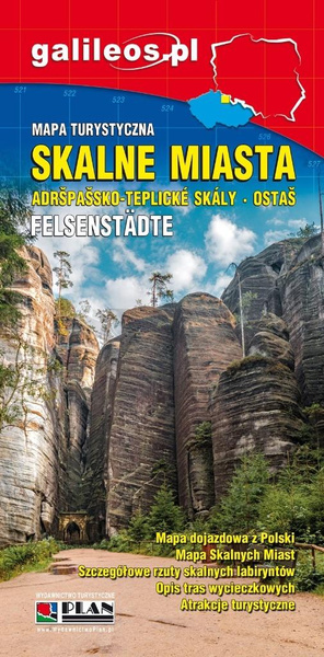 Nowe wydanie popularnej mapy Skalnych Miast będących jedną z największych atrakcji turystycznych w północnych Czechach, tuż przy granicy z Polską. Mapa w skali 1:35 000 obejmuje obszar Aderszpaskich i Teplickich skał wraz z okolicami. Obszar mapy obejmuje również Mieroszów i Chełmsko Śląskie, co szczególnie ułatwi dotarcie w ten rejon osobą przybywającym z okolic Jeleniej Góry i Wałbrzycha. Dodatkowo mapa zawiera szczegółowy schemat każdego ze Skalnych Miast wraz z prowadzącymi przez nie trasami turystycznymi w skali 1:5 000 (Teplickie Skały i Aderszpaskie Skaly) oraz1:7 000 (Osta). Na rewersie znajdziemy również mapę dojazdową w skali 1:220 000 oraz opis turystyczny ze zdjęciami.