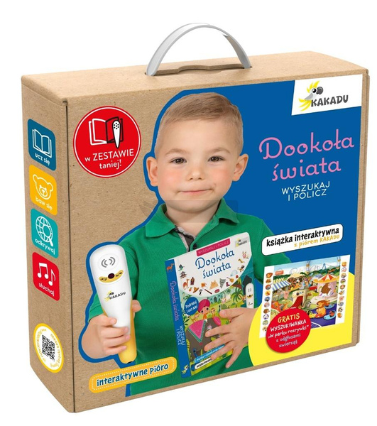 Dookoła świata. Wyszukaj i policz to książka interaktywna z piórem Kakadu, które uruchamia zakodowane na stronach teksty i dźwięki. Publikacja jest częścią innowacyjnego systemu nauki i zabawy w jednym.