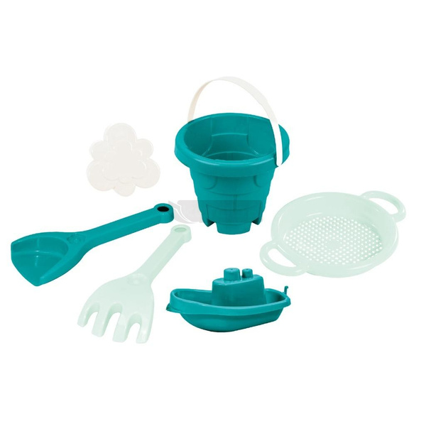 Zestaw do piasku Zamek z serii Toys in Trends w kolorze nasyconego turkusu, mlecznej mięty oraz bieli spodoba się wszystkim miłośnikom twórczej zabawy w piasku. W skład zestawu wchodzi 6 elementów: oryginalne wiaderko w kształcie zamku, grabki, łopatka, sitko, foremka w kształcie rozgwiazdy oraz stateczek. Zestawy letnie od marki Wader są odporne na warunki atmosferyczne takie jak deszcz czy słońce, zatem pozostawienie elementów zestawu w piaskownicy lub na balkonie nie grozi zniszczeniem ani odbarwieniem kolorów. Komplet do piasku daje dziecku możliwość kreatywnej zabawy, zarówno w towarzystwie rówieśników, jak i samodzielnie. Zestaw pobudza wyobraźnię najmłodszych. Daje szansę poznania i zaproszenia do wspólnej zabawy nowych znajomych, co pomoże dziecku w rozwoju jego kompetencji społecznych, nauczy zachowania w grupie. Twórcza zabawa w piasku pobudza wyobraźnię dzieci, wspiera ich aktywność ruchową oraz sprawność i koordynację manualną oraz motoryczną. Całość wyprodukowana z bezpiecznych i wytrzymałych materiałów. Zwiń Opis techniczny oryginalna kolorystyka turkusowo-miętowo-biała idealnie pasująca do pokoju dziecięcego w tej samej kolorystyce pełni funkcję zabawki oraz ozdoby pokoju jednocześnie w skład zestawu wchodzi 6 elementów: oryginalne wiaderko w kształcie zamku o pojemności 1 litra, grabki, łopatka, sitko, foremka w kształcie rozgwiazdy oraz stateczek zestaw daje możliwość zabawy w grupie rówieśników, w rodzinie czy też w pojedynkę zabawa z wykorzystaniem kompletu do piasku Zamek daje możliwość kreatywnej zabawy, pobudza wyobraźnię i twórcze myślenie dziecka, wspiera jego aktywność ruchową oraz sprawność i koordynację manualną; pomaga w nawiązywaniu kontaktów z innymi dziećmi, uczy zachowania w grupie przeznaczone dla dzieci 1+