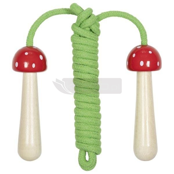 Skakanka z bawełnianą linką oraz drewnianymi rączkami w kształcie muchomora. Doskonała do ćwiczenia równowagi, koordynacji oraz kondycji fizycznej, ucząca współpracy i zdrowej rywalizacji. Wspaniała do zabawy w domu lub na dworze.