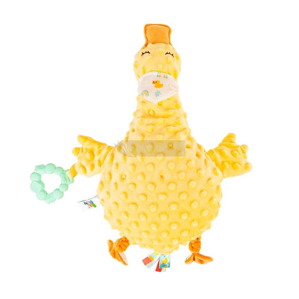 Żółciutka kaczuszka to wymarzona przytulanka każdego bobasa! Jest milusia i urocza, a jej skrzydełko zdobi gryzaczek, który przyniesie ulgę obolałym dziąsłom ząbkującego dziecka. Zabawka posiada szeleszczące skrzydełko, chusteczkę na szyi i metki doszyte w miejscu ogonka. Kaczuszka uszyta została z materiałów o zróżnicowanych fakturach, dzięki czemu zabawa z nią wspomaga rozwój zdolności poznawczych malucha.