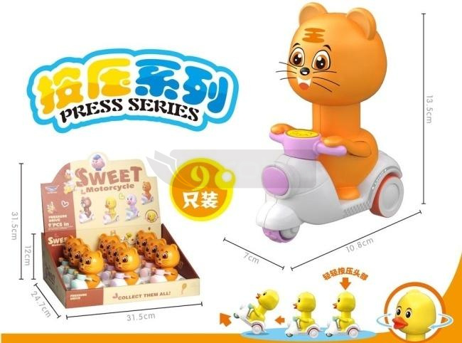Zabawny Tygrys na Motorze - Radość z Każdym Naciśnięciem! (Opakowanie zbiorcze 9 sztuk) Przedstawiamy niezwykle sympatycznego Tygryska na Motorze, który z pewnością wywoła uśmiech na twarzy każdego dziecka. Ten kolorowy i interaktywny pojazd to prosta, a zarazem wciągająca zabawka. Aby wprawić tygryska w ruch, wystarczy nacisnąć jego głowę, a on pomknie przed siebie, dostarczając mnóstwo frajdy. Zabawka charakteryzuje się prostą obsługą, dzięki czemu nawet najmłodsze dzieci poradzą sobie z nią bez problemu. Kompaktowe rozmiary sprawiają, że tygrysek na motorze idealnie mieści się w małych rączkach i można go zabrać ze sobą wszędzie. Opakowanie zbiorcze zawiera aż 9 sztuk uroczych tygrysków na motorach, co czyni go doskonałym wyborem dla przedszkoli, sal zabaw, jako nagrody w konkursach lub po prostu jako większy zapas ulubionych zabawek. Cena za 1szt.