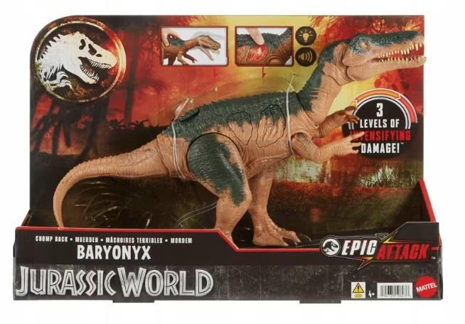 Przygotuj się na wartką akcję i przygody wprost ze świata Jurassic World! Figurka dinozaura Baryonyx Epic Attack przenosi Cię w świat Jurassic World dzięki dźwiękom oraz 3 poziomom narastających obrażeń. Naciśnięcie tylnej części tułowia wywołuje ryk i atak CHIP, ujawniając obrażenia na szyi! Wielokrotne naciśnięcie uszkodzonego obszaru tułowia powoduje włączenie coraz większego natężenia światła, podkreślającego obszar uszkodzenia, a także generuje różne efekty dźwiękowe. Zeskanuj ukryty kod śledzenia w bezpłatnej aplikacji Jurassic World Play za pomocą kompatybilnego urządzenia inteligentnego (z systemem Android lub iOS, nie są dołączone), aby odblokować doświadczenia AR i niesamowicie wciągające zabawy! Świetny prezent dla fanów dinozaurów w wieku od 4 lat. Zabawki dinozaurów Jurassic World Domion są sprzedawane pojedynczo, a każda z nich jest wyjątkowa i niepowtarzalna. Obudź wspaniałe bitwy zwierząt ze swoimi wyjątkowymi dinozaurami dla dzieci. To świetny prezent dla dzieci w wieku 4+, zwłaszcza jeśli lubią Jurassic World, dinozaury i gry akcji.