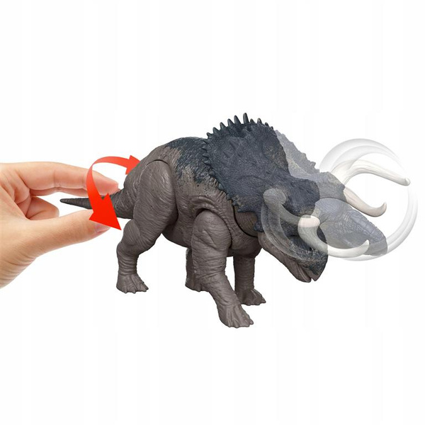 Przygotuj się na wartką akcję i przygody wprost ze świata Jurassic World! Z tą inspirowaną światem Jurassic World figurką Nasutoceratops Ryczący dinozaur czeka Cię dzika zabawa. Postaw na totalny atak! Ruszaj ogonem dinozaura w górę i w dół, aby aktywować imponujący atak, któremu towarzyszy dziki ryk. Potem przekręć ogon, aby zmienić kierunek ataku i urozmaicić akcję! Ta mierząca ok. 30 cm długości zabawka inspirowana filmem ma punkty ruchu w sam raz do dynamicznej zabawy i prezentowania w kolekcji. Dodatkowo, wystarczy zeskanować kod tropiący z nogi dinozaura w bezpłatnej aplikacji Jurassic World Play za pomocą kompatybilnego smartfona/tabletu (z Androidem lub iOS – nie znajduje się w zestawie), aby uzyskać dostęp do wirtualnej wersji dinozaura i zagrać w grę wyścigową na lądzie, morzu i w powietrzu. Dinozaur zabawka Nasutoceratops to świetny pomysł na prezent dla fanów dinozaurów od 4 roku życia. Zabawki dinozaurów Jurassic World Domion są sprzedawane pojedynczo, a każda z nich jest wyjątkowa i niepowtarzalna. Obudź wspaniałe bitwy zwierząt ze swoimi wyjątkowymi dinozaurami dla dzieci. To świetny prezent dla dzieci w wieku 4+, zwłaszcza jeśli lubią Jurassic World, dinozaury i gry akcji.