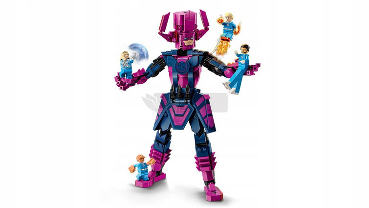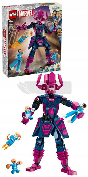 Zestaw LEGO | Marvel zawiera cztery minifigurki: Pana Fantastic z rozciągliwymi nogami, Ludzką Pochodnię z dwoma miotaczami ręcznymi i elementami płomieni przymocowanymi do stóp, a także przezroczystą podpórką, która imituje latanie. Ponadto w zestawie jest minifigurka Niewidzialnej Kobiety z dwoma polami siłowymi i Stwora z potężnymi dłońmi. W pełni ruchoma figurka kultowego złoczyńcy z filmu, Galactusa, ma 28 cm wysokości i zachęca do niekończącej się zabawy w bitwę między bohaterami. Dodatkową cyfrową zabawę zapewnia intuicyjna aplikacja LEGO Builder, w której można powiększać i obracać modele w 3D i śledzić postępy. Zestaw zawiera 427 elementów.