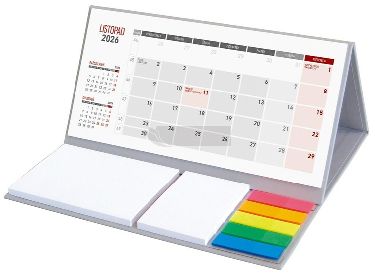 Wygodny kalendarz stojący na biurko z przejrzystym kalendarium w układzie miesięcznym z poręcznymi karteczkami samoprzylepnymi do notowania. Przydatny zwłaszcza w biurze. W kalendarzu zaznaczono święta.