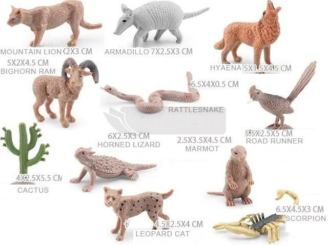 Odkryj świat pustyni z zestawem realistycznych figurek zwierząt - Idealne do zabawy edukacyjnej i kolekcjonowania! Przenieś się w fascynujący świat pustyni z naszym kompleksowym zestawem 11 realistycznych figurek zwierząt i roślin pustynnych! Ten wyjątkowy zestaw został zaprojektowany z myślą o małych odkrywcach, ale sprawdzi się również jako element kolekcji dla starszych pasjonatów przyrody. W skład zestawu wchodzą: Lew górski (Mountain Lion): Majestatyczny drapieżnik pustyni. Pancernik (Armadillo): Unikalny ssak z charakterystycznym pancerzem. Hiena (Hyaena): Sprytny padlinożerca. Grzechotnik (Rattlesnake): Groźny gad z grzechotką. Kaktus (Cactus): Ikoniczna roślina pustynna. Owca górska (Bighorn Ram): Imponujący roślinożerca. Jaszczurka rogata (Horned Lizard): Fascynujący gad pustynny. Marmot (Marmot): Uroczy gryzoń. Biegacz naziemny (Road Runner): Szybki ptak pustynny. Lampart (Leopard Cat): Elegancki drapieżnik. Skorpion (Scorpion): Niebezpieczny stawonóg. Każda figurka została wykonana z wysokiej jakości, trwałego materiału, z niezwykłą dbałością o detale, co sprawia, że modele są wiernym odwzorowaniem swoich odpowiedników w naturze. Realistyczne kolory i faktury zachęcają do kreatywnej zabawy i nauki o różnorodności ekosystemów pustynnych. Dlaczego warto wybrać nasz zestaw? Edukacja przez zabawę: Dzieci mogą poznawać nazwy zwierząt, ich wygląd i cechy, rozwijając jednocześnie wyobraźnię i umiejętności narracyjne. Wysoka jakość wykonania: Trwałe figurki, które posłużą przez długi czas. Idealny prezent: Doskonały upominek dla małych miłośników zwierząt, na urodziny, święta czy inne okazje. Kompaktowe rozmiary: Łatwe do przechowywania i zabierania w podróż. Rozbudź ciekawość świata w swoim dziecku i podaruj mu ten fascynujący zestaw figurek zwierząt pustyni!