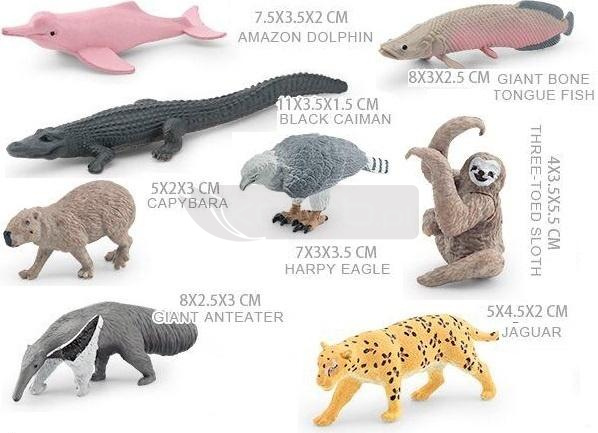 Odkryj fascynujący świat fauny Ameryki Południowej dzięki naszemu zestawowi 8 realistycznych figurek zwierząt! Każda figurka została starannie wykonana z dbałością o detale, wiernie odwzorowując charakterystyczne cechy każdego gatunku. W zestawie znajdziesz: Amazon Dolphin (różowy delfin słodkowodny): 7.5x3.5x2 cm Black Caiman (Czarny Kajman): 11x3.5x1.5 cm Giant Bone Tongue Fish (Arapaima): 8x3x2.5 cm Capybara (Kapibara): 5x2x3 cm Harpy Eagle (Harpia wielka): 7x3x3.5 cm Three-Toed Sloth (Leniwiec trójpalczasty): 4x3.5x5.5 cm Giant Anteater (Mrówkojad wielki): 8x2.5x3 cm Jaguar (Jaguar): 5x4.5x2 cm Ten wyjątkowy zestaw to doskonała propozycja dla małych odkrywców, miłośników zwierząt oraz kolekcjonerów. Figurki idealnie sprawdzą się do kreatywnej zabawy, rozwijania wyobraźni oraz jako pomoc dydaktyczna podczas nauki o różnorodności biologicznej. Wykonane z trwałego materiału, zapewnią wiele godzin edukacyjnej rozrywki. Doskonały prezent na każdą okazję!
