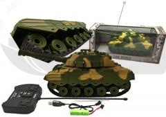 Zdalnie sterowany wojskowy czołg na gąsienicach z efektami świetlnymi i dźwiękowymi. Pojazd zasilany akumulatorem (w zestawie + ładowarka). Pilot zasilany 2xAA (nie zawiera). Wykonany z bezpiecznych i solidnych materiałów.