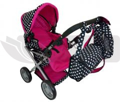 Wózek posiada: ładne metalowe rurki, szybkie składanie, blokadę przed samoczynnym złożeniem się wózka, materiał solidny bawełniany z możliwością zdjęcia do prania, duży kosz na zakupy, wyjmowane nosidło, pościel, regulowaną wysokość rączki, torbę, pasy w wersji spacerowej.