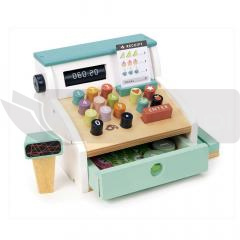 Dzieciom spodoba się kasowanie zakupów za pomocą tej zabawnej i kolorowej drewnianej kasy. Wsuń karty kredytowe wzdłuż rowka, włóż jeden z 5 wydrukowanych paragonów do szczeliny, przekręć małe pokrętło, aby wyświetlić różne ceny w okienku. Dzieci będą się dobrze bawić, naciskając różnokolorowe przyciski i otwierając tacę, aby wydać 5 drewnianych monet i 9 arkuszy kolorowych papierowych pieniędzy.