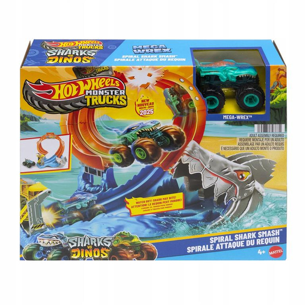 W zestawie do zabawy Hot Wheels Monster Trucks Pętla rekina wygłodniały drapieżnik tylko czeka, by „schrupać” Mega-Wrexa, ale epickie sztuczki kaskaderskie i brawurowa jazda mogą pomóc w pokonaniu przeciwnika i dać Monster Truckowi możliwość ucieczki. Wystartuj znajdującym się w zestawie samochodem zabawką Mega-Wrex w skali 1:64 przez pętlę z wystarczającą siłą, aby pokonać rekina i doprowadzić do demolki toru! Jeśli uderzysz w wyrzutnię za lekko – odpadniesz i przegrasz. Resetowanie zestawu jest szybkie i proste. Na górze pętli czeka też miejsce parkingowe na dołączony pojazd. Zestaw zawiera 1 autko Hot Wheels Monster Truck