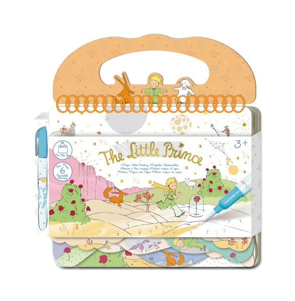 Magiczne wodne kolorowanie - bez bałaganu, gdzie tylko chcesz! Książka z pięknymi obrazami do kolorowania (wielokrotnego użytku) inspirowanymi książką Mały Książę. Napełnij pisak wodą, a następnie rysuj, aby odsłonić kolory na stronach - zniknie, gdy woda wyschnie, potem zacznij od nowa! To niekończąca się zabawa! Dla dzieci powyżej 3-go roku życia. Zawartość: 6 wielorazowych wodnych kolorowanek, naklejek i długopis na wodę.