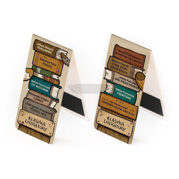 Gdyby Twój pies był odpowiedzialny za domową biblioteczkę, nie mogłoby w niej zabraknąć prawdziwych klasyków psiej literatury. Znasz ,,Odprawę psów greckich" albo ,,Psy bezdomne"? Jeśli nie, czas nadrobić zaległości! Nasza zakładka przyda Ci się nie tylko do tego, by zaznaczać miejsce, w którym przerywasz lekturę. Sięgnij po nią i po wszystkie książki z listy psich bestsellerów, by wreszcie mieć o czym kulturalnie pokonwersować ze swoim czworonogiem. Zaokrąglone rogi, papier kreda 350 g, folia zabezpieczająca błysk, folia magnetyczna na kawałku zakładki