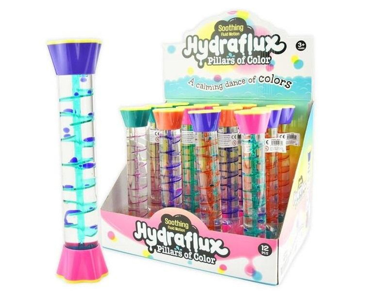 Klepsydra wykonana jest z przeźroczystego, gładkiego w dotyku tworzywa. W środku znajduje się płyn o konsystencji żelu. Po obróceniu zauważamy powolne przelewanie się i mieszanie cieczy w bardzo powolnym tempie. Spirala dodatkowo spowalnia ruch oraz magicznie rozdziela poszczególne krople. Obserwacja pozwala nam uspokoić wzrok, wyciszyć myśli. Dobrze wpływa na koncetrację wzrokową.