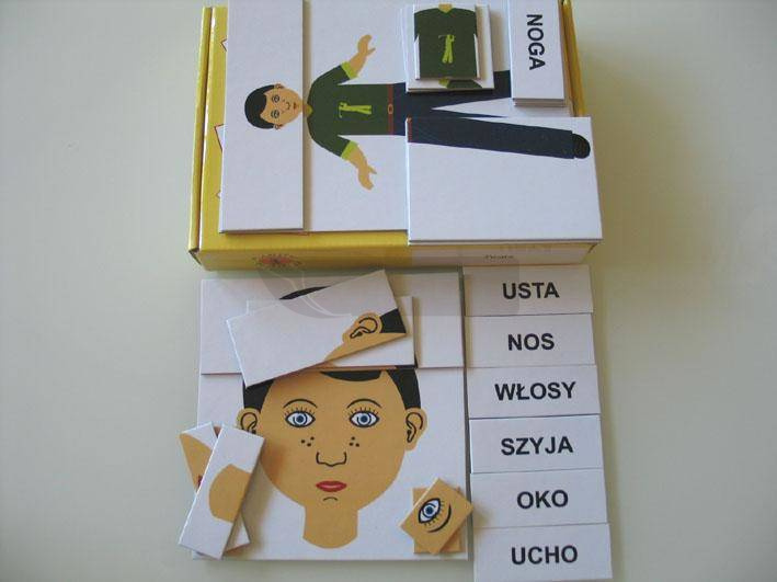 Zestaw ten służy do nauki układania postaci (twarzy) z elementów według wzoru, z pamięci oraz czytania pełnymi wyrazami (czytanie globalne) nazw części ciała (części twarzy), rozumienie pytań: Co to? Gdzie masz.......?,Gdzie ma......?