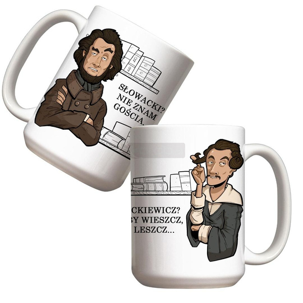 Mistrzowie ciętej riposty doskonale wiedzą, że nic tak nie pobudza elokwencji i fantazji, jak aromatyczna kawa lub... coś mocniejszego. Przyrządzisz ją w naszym pojemnym kubku z wieszczami. Nie musisz wybierać swojego ulubieńca - kubek ma obustronny nadruk. Znajdziesz na nim zarówno Adasia, jak i Julka. Pojemność: 440ml Wysokość: 120 mm Średnica: 85 mm Materiał: ceramika