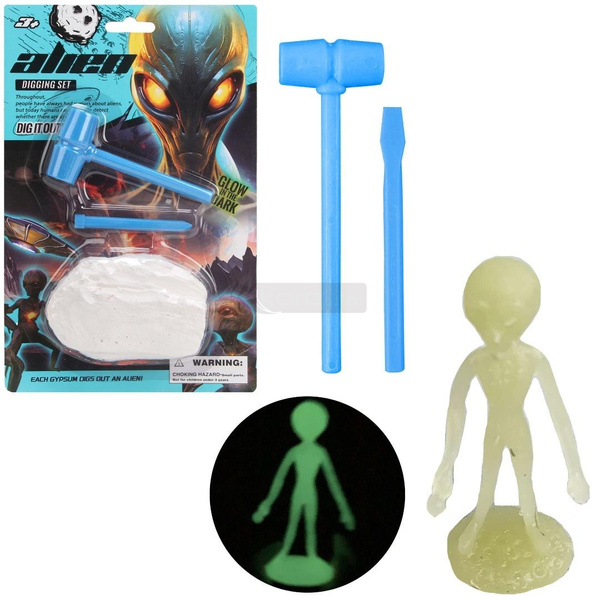 Zestaw do Odkopywania Obcego - Odkryj Świecącego Kosmitę! Przenieś się w świat kosmicznych tajemnic i archeologicznych odkryć dzięki temu fascynującemu zestawowi do odkopywania! To idealna zabawka dla małych naukowców i fanów UFO, która zapewni wiele godzin kreatywnej zabawy i z pewnością zaskoczy efektem końcowym. Główne cechy produktu: Zestaw "Digging Set": Kompletny zestaw do samodzielnego "odkopywania" figurki obcego. Składa się z bloku gipsowego (lub masy podobnej do gipsu), w którym ukryta jest figurka kosmity. Narzędzia do kopania: Do zestawu dołączone są plastikowe narzędzia - młotek i dłuto (lub skrobak), które pozwalają na precyzyjne wydobycie figurki z bloku. Świecąca w ciemności figurka: Najbardziej ekscytującą cechą jest figurka obcego, która świeci w ciemności! Po naświetleniu (np. światłem słonecznym lub lampą), figurka emituje delikatne, zielonkawe światło w ciemnym pomieszczeniu, co dodaje zabawie magii i zaskoczenia. Rozwija cierpliwość i precyzję: Proces odkopywania wymaga cierpliwości i precyzyjnych ruchów, co doskonali zdolności manualne dziecka. Pobudza wyobraźnię: Tematyka kosmiczna i element odkrywania nieznanego stymulują wyobraźnię i zachęcają do tworzenia własnych historii o kosmitach. Idealny na prezent: Zestaw jest estetycznie zapakowany na blistrze z grafiką tajemniczego kosmity, co sprawia, że jest gotowym i atrakcyjnym prezentem dla każdego małego odkrywcy. Zalecany wiek: 3+ Wielkość opakowania: 16x24x3 cm Daj swojemu dziecku szansę na ekscytujące odkrycie i posiadanie własnego, świecącego w ciemności kosmity!