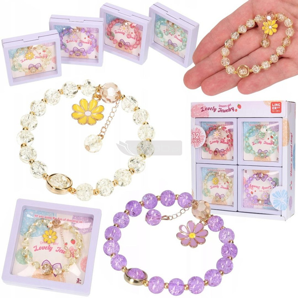 Urocze Bransoletki "Lovely Jewelry" z Koralików - Zestaw dla Małej Damy! Ten przepiękny zestaw bransoletek "Lovely Jewelry" to idealny prezent dla każdej dziewczynki, która uwielbia biżuterię i pragnie poczuć się wyjątkowo! Zestaw zawiera 12 uroczych bransoletek, każda zapakowana w eleganckie, indywidualne pudełeczko, co czyni go doskonałym pomysłem na upominek, nagrodę, czy element imprezy urodzinowej. Główne cechy produktu: Efektowne koraliki: Bransoletki wykonane są z koralików imitujących kryształki, które pięknie mienią się w świetle. Dostępne są w różnych kolorach, m.in. przezroczystym, fioletowym, różowym, turkusowym, co dodaje im uroku. Urocze zawieszki: Każdą bransoletkę zdobi urocza zawieszka - kwiatek w pastelowych kolorach (żółty, fioletowy, różowy, niebieski) oraz dodatkowe, mniejsze koraliki lub ozdobne elementy. Indywidualne, eleganckie pudełeczka: Każda bransoletka jest zapakowana w małe, przeźroczyste pudełeczko, które idealnie nadaje się do przechowywania biżuterii, a także sprawia, że zestaw jest od razu gotowy na prezent. Pudełeczka posiadają ozdobne tło z motywami kwiatowymi i napisem "Lovely Jewelry". Rozwija kreatywność i poczucie estetyki: Noszenie biżuterii pozwala dzieciom wyrażać siebie i rozwijać własny styl. Idealne na różne okazje: Doskonałe na prezent urodzinowy, imieninowy, Dzień Dziecka, jako nagroda lub upominek dla uczestników przyjęcia. Bezpieczne dla dzieci: Bransoletki wykonane są z bezpiecznych materiałów, odpowiednich dla dzieci. Zalecany wiek: 3+ (zgodnie z oznaczeniem na opakowaniu). Wielkość opakowania 9x9x1 cm Daj małej damie radość z posiadania własnej biżuterii i obserwuj, jak rozkwita jej styl z zestawem bransoletek "Lovely Jewelry"!