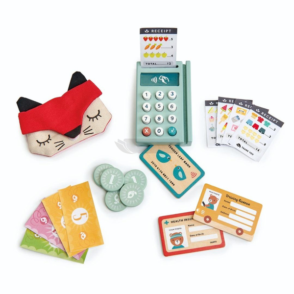 Drewniany terminal płatniczy z akcesoriami, Tender Leaf Toys Idealne akcesorium podczas zabawy w sklep! W zestawie: drewniany terminal płatniczy z przyciskami oraz z czytnikiem do przeciągania kart, rachunki za zakupy, karta płatnicza oraz portmonetka z papierowymi banknotami, drewnianymi monetami, dowodem osobistym i kartą zdrowia. Akcesorium idealne do naszego drewnianego sklepiku, kawiarenki czy lodziarni! Wspaniała zabawa, która uczy umiejętności społecznych oraz liczenia i wydawania reszty. Terminal został wykonany z największą starannością! Kolorowe przyciski, drewniane monety z nadrukiem, rachunki z rysunkami kupionych towarów - w Tender Leaf Toys detale są dla nas bardzo ważne! Nasze zabawki produkowane są z drzewa kauczukowego, pochodzącego z kraju położonego na 13 tysiącach rajskich wysp - Indonezji. Do ich pomalowania użyliśmy bezpiecznych i delikatnych farb, dzięki czemu drewno zachowało swój naturalny wygląd i widoczną strukturę. Drewno kauczukowe cechuje się wyjątkową wytrzymałością, co jest niewątpliwym atutem zabawek Tender Leaf Toys. W trosce o naturę, w miejsce każdego drzewa wykorzystanego do produkcji zabawek Tender Leaf Toys, sadzimy nowe drzewo. W Tender Leaf Toys dbamy o zrównoważony rozwój planety i ochronę środowiska naturalnego. Zabawki Tender Leaf Toys tworzone są z myślą o najmłodszych przez brytyjską projektantkę Danielle Hanson, która od lat związana jest z branżą dziecięcą. Dzięki jej doświadczeniu, pasji i niezwykłej wyobraźni, zabawki marki Tender Leaf Toys pięknie odwzorowują detale otaczającego nas świata, jak również dbają o rozwój zdolności manualnych i poznawczych dzieci. Wszystkie etapy produkcji zabawek Tender Leaf Toys odbywają się w jednym miejscu, z najwyższą dbałością o środowisko - w egzotycznej Indonezji, kraju słynącym z poszanowania dla własnej kultury i zasobów naturalnych.