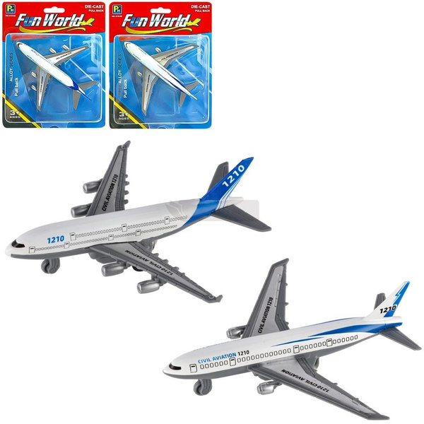 Metalowy Model Samolotu Pasażerskiego (Die-Cast) z Napędem Pull-Back Wznieś się w powietrze z tym wysokiej jakości modelem samolotu pasażerskiego! Ta precyzyjnie wykonana zabawka jest idealna dla każdego młodego entuzjasty lotnictwa, oferując wiele godzin dynamicznej i ekscytującej zabawy. Cechy produktu: Konstrukcja Die-Cast: Samolot został wykonany z trwałego stopu metali (seria Alloy Series) z elementami plastikowymi, co gwarantuje jego wytrzymałość i odporność na intensywne użytkowanie. Napęd Pull-Back: Zabawka wyposażona jest w mechanizm naciągu (pull-back) - wystarczy pociągnąć samolot do tyłu i puścić, aby dynamicznie ruszył do przodu, dostarczając mnóstwo radości. Realistyczne detale: Model odzwierciedla wygląd prawdziwego samolotu pasażerskiego, z dbałością o szczegóły, takie jak cztery silniki, oznaczenia "CIVIL AVIATION 1210" oraz charakterystyczne, eleganckie malowanie w kolorach białym, szarym i niebieskim. Wielkość: Produkt jest kompaktowy i idealnie pasuje do małych rączek dziecka. Wielkość opakowania: 21x17x4 cm Dodatkowe informacje: Seria: Fun World Die-Cast Wiek: Rekomendowany dla dzieci od 3. roku życia. Ten model to świetny pomysł na prezent dla przyszłego pilota lub kolekcjonera.