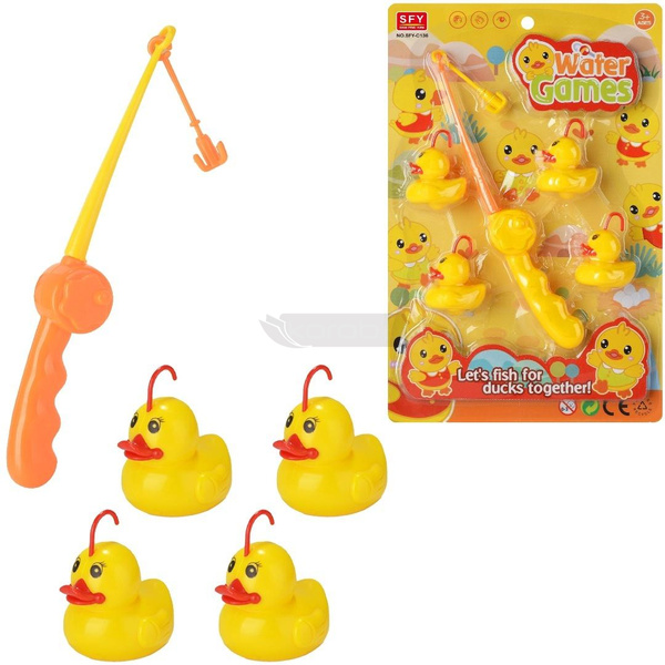 Zestaw do Łowienia Kaczek "Water Games" - Wspaniała Zabawa w Kąpieli i Nie Tylko! Przedstawiamy uroczy zestaw do łowienia kaczek z serii "Water Games", który zamieni każdą kąpiel, basenik czy nawet miskę z wodą w prawdziwe wędkarskie pole do popisu! Ta wesoła zabawka zapewni godziny radości i pomoże rozwijać zdolności manualne najmłodszych. Cechy produktu: Kompletny Zestaw: W skład zestawu wchodzi jedna żółto-pomarańczowa wędka z haczykiem oraz cztery urocze, żółte kaczuszki z pętelkami na głowach, gotowe do złowienia. Wesołe Kaczuszki: Każda kaczuszka jest lekka i pływająca, a specjalne pętelki ułatwiają celowanie i zaczepianie ich haczykiem wędki. Ich klasyczny wygląd i intensywny kolor przyciągają uwagę dziecka. Rozwój Umiejętności: Zabawa w łowienie kaczek doskonale wpływa na rozwój koordynacji ręka-oko, precyzji ruchów oraz cierpliwości u dziecka. Jest to także świetny sposób na zachęcenie maluchów do kąpieli. Idealna do Wody: Zabawka jest przeznaczona do użytku w wodzie, dzięki czemu sprawdzi się podczas codziennej kąpieli w wannie, zabawy w baseniku ogrodowym czy nad jeziorem (pod nadzorem osoby dorosłej). Bezpieczeństwo: Produkt jest przeznaczony dla dzieci w wieku 3 lat i starszych (zgodnie z oznaczeniem "3+" na opakowaniu), co gwarantuje bezpieczeństwo użytkowania dla tej grupy wiekowej. Atrakcyjne Opakowanie: Zestaw jest zapakowany w kolorowy blister z wizerunkami wesołych kaczuszek, co czyni go idealnym pomysłem na prezent na każdą okazję. Na opakowaniu widnieje hasło "Let's fish for ducks together!", zachęcające do wspólnej zabawy. Wielkość opakowania: 26x17x3 cm Idealny dla: Dzieci uwielbiających zabawę w wodzie. Rodziców szukających edukacyjnych zabawek do kąpieli. Prezentu na urodziny, Dzień Dziecka czy inną okazję. Zapewnij swojemu dziecku mnóstwo śmiechu i wodnej przygody z naszym zestawem do łowienia kaczek!