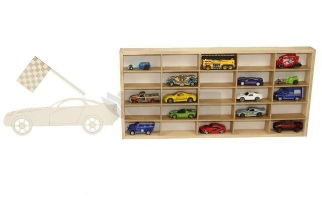 Autko - naturalna półka - ekspozytor na autka / resoraki (do przyklejenia na ścianie). Zawiera 25 przegródek, w których można umieścić autka / resoraki, figurki i nne. Wymiar przegródek: 9 * 4 * 3,5 cm, rama z drewna kolor naturalny. Kolor autka - biały. Dodatkowo biała chorągiewka