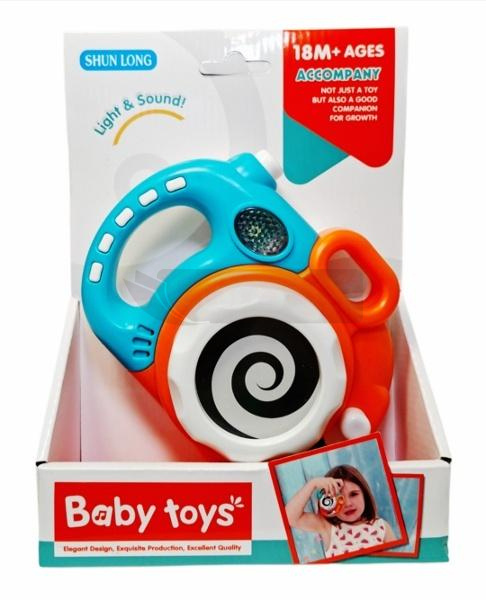 Zabawka aparat fotograficzny z efektem świetlnym i dźwiękowym. Zapakowany w kartonowe pudełko. Zabawka przeznaczona dla dzieci od 18 miesiąca życia. Zabawka działa na baterie typu AAA. Baterie nie są załączone do zabawki. Podane wymiary są wymiarami opakowania.