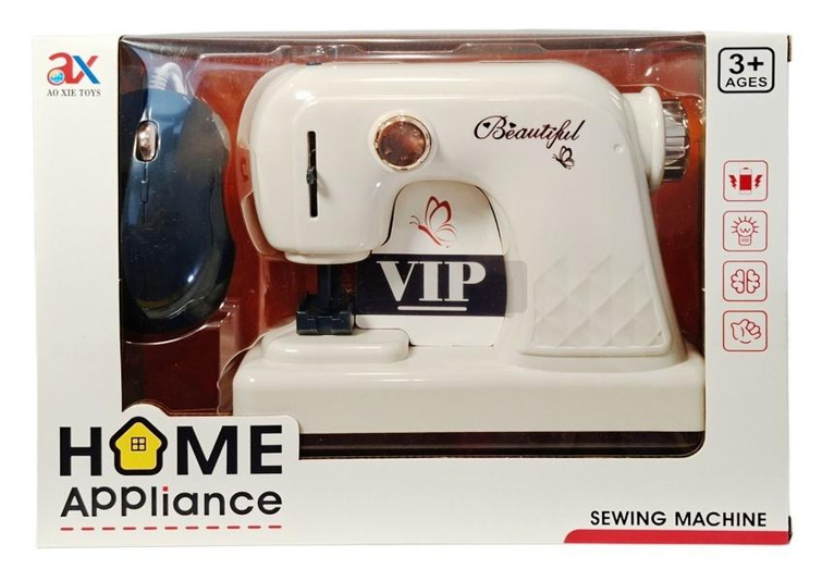 Zabawka maszyna do szycia z pedałem, w klasycznej kolorystyce. Pozwala na kreatywną zabawę w szycie. Zapakowana w kartonowe pudełko. Zabawka przeznaczona dla dzieci od lat 3. Produkt działa na baterie typu AA. Baterie nie są załączone do zabawki. Podane wymiary stanowią wymiar opakowania.