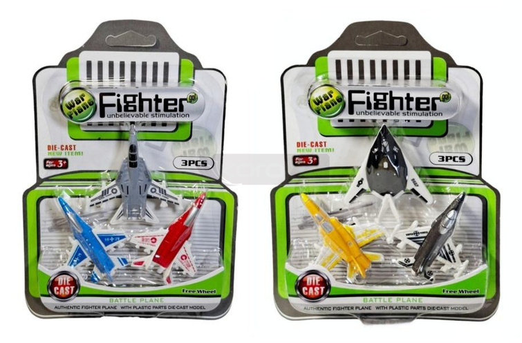 Zestaw 3 metalowych samolotów myśliwskich z elementami plastikowymi. Zapakowany na blistrze. Zabawka przeznaczona dla dzieci od lat 3. Podane wymiary stanowią wymiar opakowania.