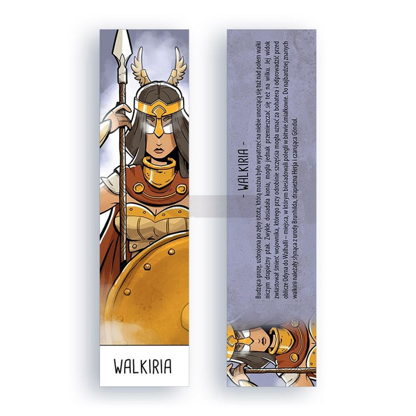 Widok Walkirii zwykle zwiastował rychłą śmierć wojownika, ale Ty nie masz się czego obawiać. Choć na co dzień pewnie toczysz różnego rodzaju boje, nasza zakładka z Walkirią będzie raczej zwiastunem jeszcze przyjemniejszej lektury. Możesz używać jej nie tylko podczas czytania książek o wielkich bitwach. Karton ozdobny perłowy 300g, sztywny, metaliczno-srebrny połysk Wymiary: 50x200mm