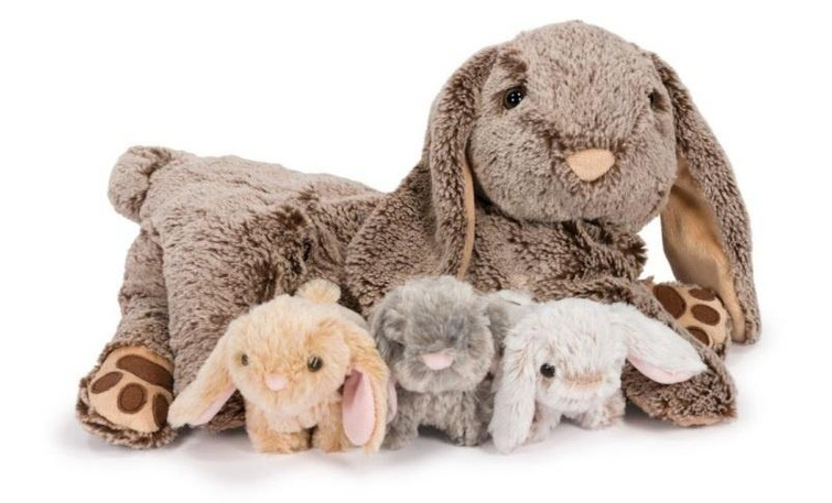 Uroczy puszysty królik mama marki Cozy Noxxiez zachwyca miękkością i pokaźnymi rozmiarami. Ma długość ok. 50 cm. Szerokość brzuszka - ok. 15 cm. Wykonana z wysokiej jakości pluszu maskotka ma brzuszek otwierany na zamek błyskawiczny. W nim mieszczą się 3 króliczki o długości ok. 18 cm. W zestawie także do złożenia samodzielnego: tekturowy, kolorowy domek w formie otwartego pudełeczka.