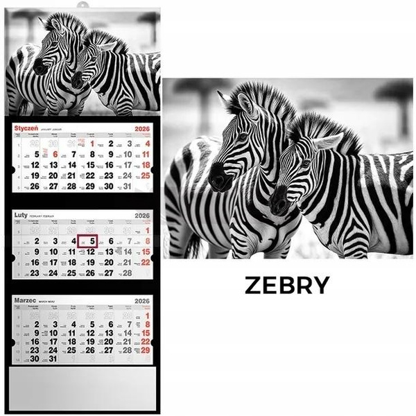 KALENDARZ TRÓJDZIELNY 2026 WYMIAR CAŁKOWITY KALENDARZA: 32 x 85,5cm GŁÓWKA KALENDARZA: Zdjęcie uszlachetniane folią błysk, z efektem wypukłości. KALENDARIUM: wym. 28,5 x 14 cm, trójjęzyczne (PL, GB, D), z numeracją tygodni i imieninami jest przytrzymywane przez kartonowe wypustki, które zapobiegają jego odstawaniu od plecków kalendarza. WYKOŃCZENIE: kartonowa zawieszka, pasek z czerwonym przesuwanym okienkiem, miejsce na notatki. WYMIAR ZDJĘCIA 32 x 22 cm ZDJĘCIE Z EFEKTEM WYPUKŁOŚCI: uszlachetnione folią błysk.