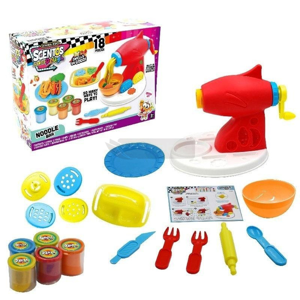 - w zestawie 18 elementów: 1 zabawkowa łyżka, 2 zabawkowe widelce, 1 zabawkowy nóż, 1 zabawkowy wałek, 4 końcówki do wyciskania, zabawkowa maszynka do tworzenia ciastolinowego makaronu, 1 zabawkowa tacka do serwowania, 1 zabawkowy talerzyk, 1 zabawkowa miska, 5 kubeczków z zapachową ciastoliną (w różnych kolorach);