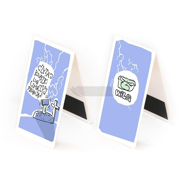 Zakładka magnetyczna dla tych, co nawet z grobu wyciągną książkę! Idealna do horrorów, thrillerów i powieści akcji! Czytasz, czy giniesz próbując. Zaokrąglone rogi, papier kreda 350 g, folia zabezpieczająca błysk, folia magnetyczna na kawałku zakładki Wymiary: 50x200mm po rozłożeniu, 50100 mm po złożeniu