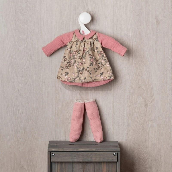 Stylowy komplet ubranek został zaprojektowany i ręcznie uszyty w Hiszpanii specjalnie dla lalek "przyjaciółek" z serii Sabrina. Rozkloszowana sukienka z kołnierzykiem została wykonana z różowego, miękkiego muślinu oraz beżowej tkaniny w finezyjny roślinny wzór. Dopełnieniem kreacji są ocieplacze wykończone białą koronką.