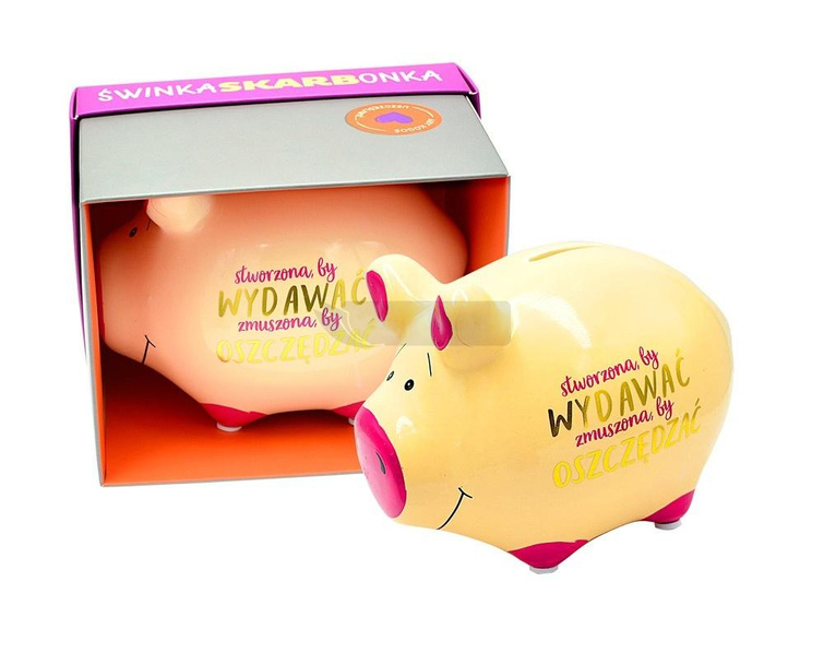 Skarbonka mała świnka SKM-006 "Stworzona, by wydawać, zmuszona, by oszczędzać" Ceramiczna skarbonka w kształcie świnki to świetny pomysł na prezent. Świnki są kolorowe i ozdobione zabawnymi tekstami, świetnie się sprawdzą jako dekoracja pokoju. Cechy szczególne: Typ produktu: skarbonka na prezent, Materiał: ceramika Wys. świnki: 8,5 cm. Waga: 214 g Wymiary pudełka: 12,5 x 10 x 10 cm (dł x szer x wys) Opakowanie: kolorowy kartonik Okazja: ogólne życzenia, urodziny
