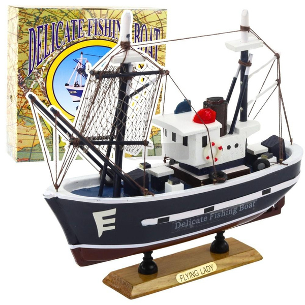 MODEL KUTRA RYBACKIEGO "FLYING LADY" - KOLEKCJONERSKA REPLIKA ŁODZI ROBOCZEJ Model "Flying Lady" to dekoracyjna replika klasycznego kutra rybackiego, inspirowana jednostkami wykorzystywanymi do połowów przybrzeżnych i portowych. Charakterystyczna nadbudówka, wysoka nadsterówka, pojedynczy maszt z olinowaniem oraz detale techniczne, takie jak imitacja radarów i kominów, nadają mu wyjątkowy, realistyczny wygląd. Całość została wykonana z drewna i ręcznie wykończona, co nadaje modelowi kolekcjonerską wartość i wyraźny morski charakter. Kadłub utrzymany jest w klasycznej kolorystyce granatu, bieli i bordo, z czytelnymi napisami oraz nazwą statku na burcie i tabliczce ekspozycyjnej. Model świetnie sprawdzi się jako ozdoba do biura, gabinetu, domowej biblioteki czy pomieszczeń w stylu industrialnym i marynistycznym. Dzięki kompaktowym wymiarom może być umieszczony nawet w niewielkiej przestrzeni, a jego obecność wprowadza klimat portowego nabrzeża i codziennej pracy na morzu. "Flying Lady" to połączenie funkcjonalnej formy z klasyczną estetyką, które docenią zarówno kolekcjonerzy, jak i osoby szukające tematycznej dekoracji wnętrz. SPECYFIKACJA: Model: Flying Lady - kuter rybacki Typ jednostki: Statek użytkowy - łódź rybacka Styl: Kolekcjonerski, dekoracyjny Wymiary modelu: 24 x 23 x 7,5 cm Wymiary opakowania: 25 x 25 x 7 cm Materiał: Drewno, tworzywo, sznurek Kadłub: Granatowo-biały z bordowym pasem Nadbudówka: Biała, z realistycznymi detalami i anteną Olinowanie: Ręcznie montowane, sieciowe Podstawka: Drewniana z tabliczką "FLYING LADY" Wykończenie: Ręczne, z dbałością o detale Zastosowanie: Dekoracja wnętrz, element kolekcji Bezpieczeństwo: Produkt zgodny z CE ZAWARTOŚĆ ZESTAWU: Model kutra "Flying Lady" Podstawka ekspozycyjna z tabliczką Opakowanie ozdobne z grafiką morską