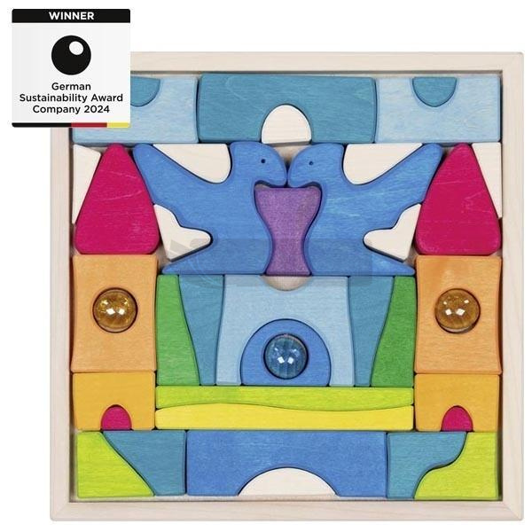 Drewniano-szklany zestaw z 41 elementami do budowania bajkowego zamku. Lśniące kamienie przyciągają uwagę, pobudzają wyobraźnię i zachęcają do tworzenia magicznych historii. Zabawa rozwija percepcję przestrzenną oraz zdolności manualne. Produkt wykonany w całości w Europie.