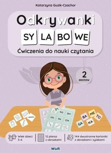 Odkrywanki sylabowe. Ćwiczenia do nauki czytania. Zestaw 2 to pomoc wspierająca naukę czytania metodą sylabową, połączona z ćwiczeniami rozwijającymi percepcję wzrokową, analizę sekwencyjną i motorykę małą. Dzięki atrakcyjnej formie i elementowi zabawy dziecko chętnie angażuje się w naukę, a czytanie staje się przyjemnością. Zestaw opiera się na słowach składających się z sylab otwartych zbudowanych ze spółgłosek: P, M, B, L, F, W, T, D, K, G, J, N. Zestaw zawiera ćwiczenia identyfikowania czarno-białych obrazków tematycznych i atematycznych (i ich konturów). Pomoc dedykowana jest: nauczycielom przedszkolnym i wczesnoszkolnym, terapeutom i logopedom pracującym z dziećmi z trudnościami w nauce czytania, rodzicom wspierającym dzieci w nauce czytania metodą sylabową. Zawartość zestawu: 12 plansz z czarno-białymi obrazkami, 144 dwustronne kartoniki z obrazkami i sylabami, instrukcja z opisem ćwiczeń, kod QR do dodatkowych materiałów. Zestaw pozwala na trening: percepcji wzrokowej analizy sekwencyjnej rozpoznawania sylab motoryki małej