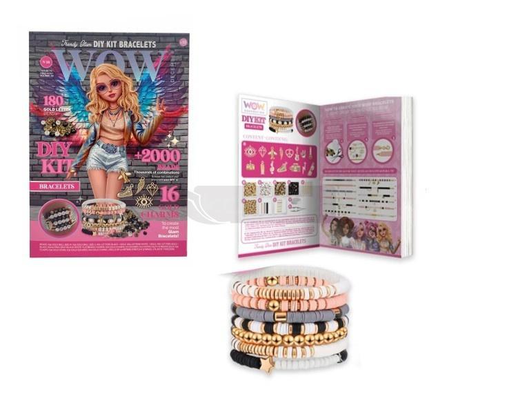 Zestaw zawiera: Ponad 2000 koralików w różnych kolorach. 180 złotych liter do pisania słów i wiadomości. 16 złotych zawieszek do dekoracji bransoletek. Łańcuszki i haczyki do montażu bransoletek. Płaskie koraliki w kolorze różowym, szarym, czarnym i białym. Złote pierścienie i haczyki dla idealnego wykończenia. Elastyczne sznurki w różnych kolorach. Plastikowe klipsy ułatwiające tworzenie. Zawiera instrukcje i wskazówki dotyczące projektowania własnej biżuterii w łatwy i przyjemny sposób.