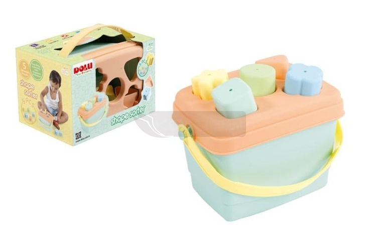 W zestawie znajdują się plastikowe klocki o różnych kształtach, które maluch dopasowuje do odpowiednich otworów w pokrywce. Zabawa w sortowanie rozwija koordynację wzrokowo-ruchową, zdolności manualne i rozpoznawanie kształtów oraz kolorów. Po zakończonej zabawie wszystkie elementy można przechować w zamykanym wiaderku z wygodnym uchwytem do przenoszenia.