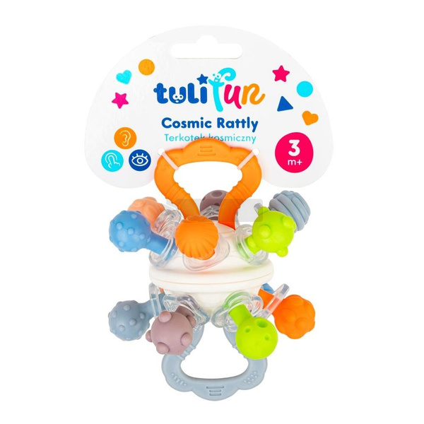 Ćwiczenie nadgarstków i ulga dla dziąsełek! Kolorowa zabaweczka posiada uchwyty z wypustkami, a po przekręceniu jej połówek w kierunkach odwrotnych względem siebie, wydaje zabawny dźwięk terkotania. Zarówno uchwyty, jak i fakturowane kuleczki sprawdzą się świetnie w roli gryzaka, co czyni terkotka nie tylko wesołą zabawką, ale też przydatnym akcesorium dla każdego bobasa.