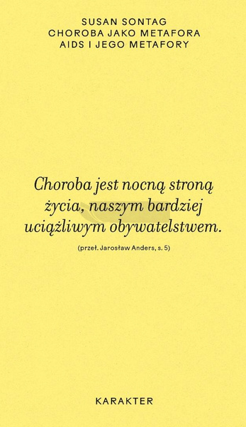 Dwa słynne eseje, które weszły do kanonu humanistyki. Analizując źródła naukowe i utwory literackie od antyku po czasy współczesne (odwołując się choćby do Homera, Baudelaire'a, Manna, Joyce'a czy Audena) Susan Sontag rekonstruuje mitologię gruźlicy i choroby nowotworowej. Pokazuje przy tym sposoby, w jakie społeczeństwo stygmatyzuje chorych i demistyfikuje ideologiczne fantazmaty, które zmierzają do demonizacji niektórych chorób. Drugi esej, napisany pod koniec lat 80., jest pionierską analizą AIDS i społecznych wyobrażeń, jakie towarzyszyły pojawieniu się tej choroby.