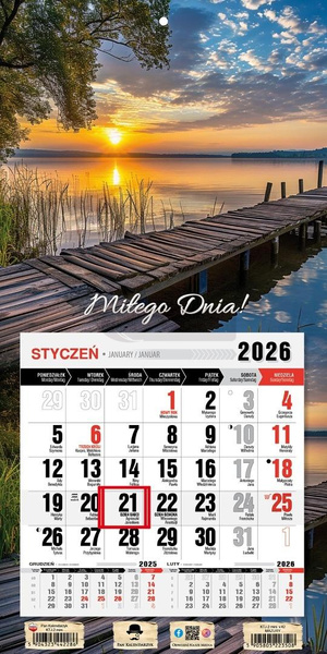Kalendarz 2026 Trójdzielny JEDNODZIELNY MINI Z MAGNESEM. Format 230/460mm. Układ kalendariów jednodzielny z przesuwnym okienkiem. Główka z otworem wierconym oraz magnesem to doskonała propozycja do przyczepienia na lodówkę. Dodatkowo nazwy miesiąca i dni tygodnia w języku Ukraińskim, Angielskim i Niemieckim. Kalendarium dodatkowo zawiera fazy księżyca i znaki zodiaku. Dużo miejsca do notowania, czytelne duże litery i cyfry.