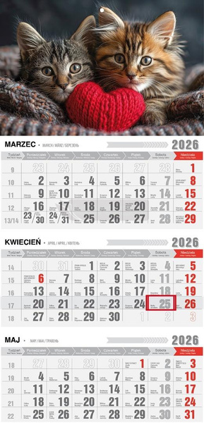Kalendarz 2026 trójdzielny z magnesem kotki