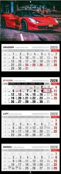 Kalendarz 2026 CZTERODZIELNY/ CZTEROMIESIĘCZNY /KWARTALNY PREMIUM Z WYPUKŁĄ GŁÓWKĄ. Format 315/890mm. Trzy komplety klasycznych kalendariów z przesuwnym okienkiem. Główka wypukła z otworem wierconym. Dodatkowo nazwy miesiąca i dni tygodnia w języku Ukraińskim, Angielskim i Niemieckim. Kalendarium dodatkowo zawiera fazy księżyca i znaki zodiaku. Dużo miejsca do notowania, czytelne duże litery i cyfry. Tematyka krajobrazy, pejzaże, zwierzęta, widoki, glamour, kawa. Nowoczesne i klasyczne wzornictwo, dopracowane wzory, czytelne kalendarium. Praktyczny i elegancki kalendarz który sprawdzi się zarówno w domu, biurze jak i innych pomieszczeniach.