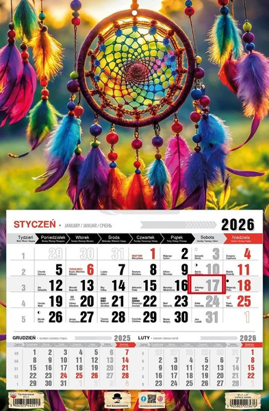 Kalendarz 2026 Trójdzielny JEDNODZIELNY. Format 315/480mm. Układ kalendariów jednodzielny z przesuwnym okienkiem. Główka z otworem wierconym. Dodatkowo nazwy miesiąca i dni tygodnia w języku Ukraińskim, Angielskim i Niemieckim. Kalendarium dodatkowo zawiera fazy księżyca i znaki zodiaku. Dużo miejsca do notowania, czytelne duże litery i cyfry.