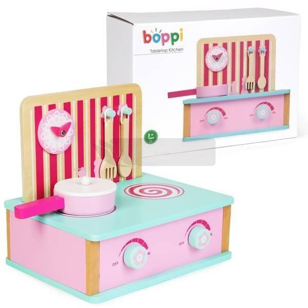 Drewniany zestaw od BOPPI to mnóstwo kreatywnej zabawy, odtwarzanie ról, gotowanie, zabawa w dom. Poręczna i wygodna drewniana kuchnia od BOPPI to duża, stołowa, słodka kuchenka z akcesoriami do gotowania. W kuchni znajdują się płyta kuchenna z pokrętłami i zegarem, składana tablica z menu, drewniany widelec i łyżka oraz rondel/patelnia. Kuchenka i akcesoria wykonane są z drewna z dbałością o detale.